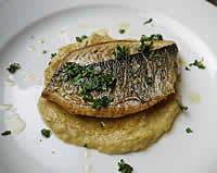 メインのシーブリームは、表面はカリカリに焼かれ、中身は熱々でジューシー。身は柔らかくペッパーが効いて味も良い。しかし、やや小さめの切り身のシーブリームは若干もの足りなく、もう少し味わいたい気分。マッシュポテトはキノコなどの香りがして、工夫して味付けされているのがうれしい。